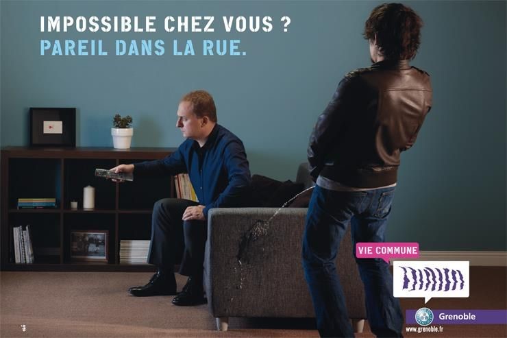 Ce serait l’exact contre-pied d’une campagne de communication menée à Grenoble il y a quelques années qui représentait un homme en train d’uriner sur un canapé et mentionnait : « Impossible chez vous ? Pareil dans la rue. » Par le doudou spatial, il serait possible de penser le passage du territoire à la place et inversement de la place au territoire selon la volonté du vivre-ensemble envisagée. La propreté : un objectif commun ou une somme de gestes individuels ? C’est là tout l’enjeu de faire société.