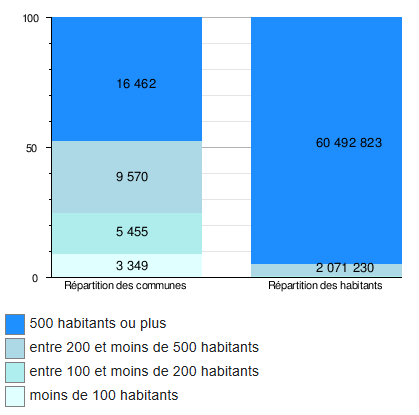 Cependant, cette rationalisation s’est superposée à une base déjà très morcelée. La France, « cul-de-sac de l’Europe », a toujours été un territoire de refuge, où les populations s’installent dans des espaces enclavés — montagnes, vallées ou villages isolés. Ce morcellement aboutit à une carte communale extraordinairement dense. Aujourd’hui encore, malgré plusieurs réformes, la France reste le pays des petites communes : sur les 35 000 recensées, 72 % comptent moins de 1 000 habitants, ne regroupant pourtant que 13,5 % de la population.