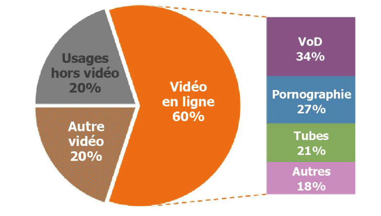 La prépondérance du format vidéo dans le trafic de données s’explique tant par l’immensité des volumes consommés que par le poids des fichiers vidéo. Quelques heures de film en haute définition pèsent davantage que tout le texte de Wikipédia (une vingtaine de giga-octets pour la langue anglaise). Les mails, forums, et médias écrits en ligne ne représentent qu’une infime fraction du trafic. Ce type d’usage, couplé à des terminaux robustes, réparables et recyclables, laisse imaginer à quoi pourrait ressembler un internet sobre en ressources.