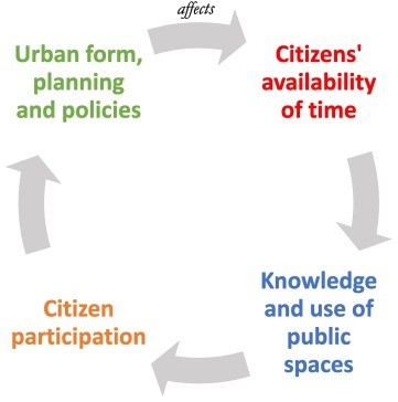 Schéma tiré de l’article « The influence of the urban model on civic involvement and public time. A study applied to the commuting population of the Greater Metropolitan Area of San José, Costa Rica ». La forme urbaine, la planification et les politiques influencent la disponibilité des citoyens, qui influence la connaissance et l'utilisation des espaces publics, qui influence la participation des citoyens, qui influence la forme urbaine, la planification et les politiques et ainsi de suite.