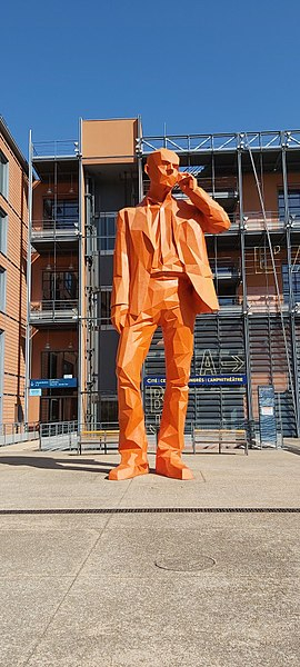 Vu la taille des bâtiments de Renzo Piano, 36 mètres de haut, il était important de gagner de l’espace en hauteur. L’Homme au téléphone mesure 8 mètres de haut ; il représente une sorte de palier intermédiaire entre les individus et la construction.
