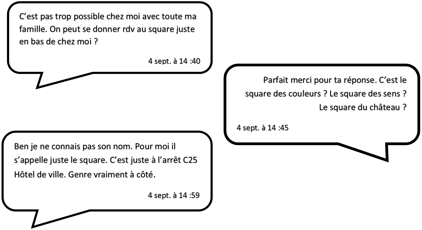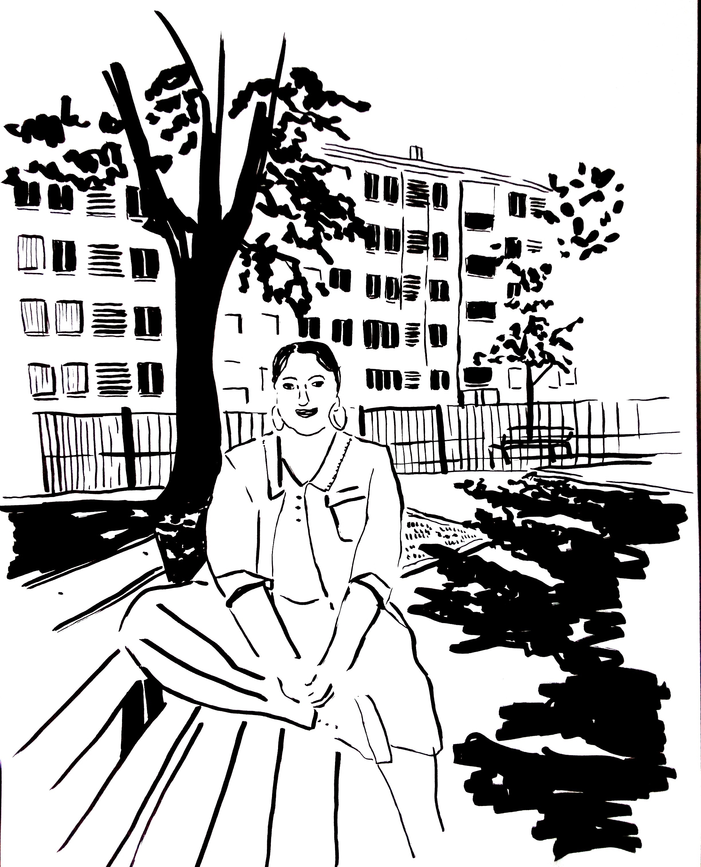 Nous nous sommes donc retrouvées dans « le square » juste en bas de chez elle, où elle allait enfant. Nous prenons place sur un banc à l’ombre, en face des jeux. Des sons du lieu nous accompagnent : le passage du tram, les chiens qui aboient, les cris des enfants, la voisine qui demande des nouvelles…