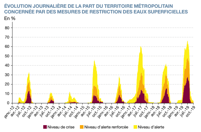 D’ores et déjà, les mesures de restriction d’eau se généralisent en période estivale. En 2019, par exemple, plus de deux tiers (67 %) de la France métropolitaine a été concerné par une mesure de restriction d’usage des eaux superficielles (SDES, 2020).