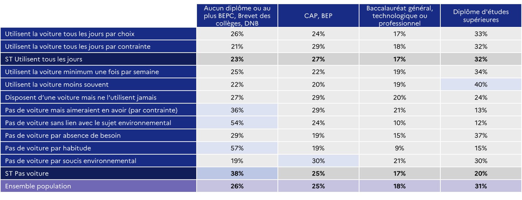 Parmi les personnes qui utilisent la voiture tous les jours, 23 % sont sans diplôme (ou au plus BEPC, Brevet), 27 % ont un CAP ou BEP, 17 % un baccalauréat et 32 % un diplôme d’études supérieur. Pour les moins diplômés, cela peut s’expliquer par l’absence de véhicule (38 %) avant tout par contrainte budgétaire alors qu’ils en désirent une. Ces derniers sont alors plus enclins dans cette situation à utiliser les mobilités douces (40 %) alors que les niveaux d’étude supérieure sans voiture moins (16 %).