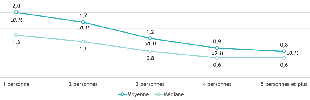 Or l’empreinte carbone du logement est très impactée par la structure familiale : les ménages d’une personne ont, en moyenne, une empreinte carbone liée au logement plus de deux fois supérieure à celle des personnes vivant dans un ménage de 4 personnes ou plus (OpinonWay, 2023 ; Boutang, 2024).