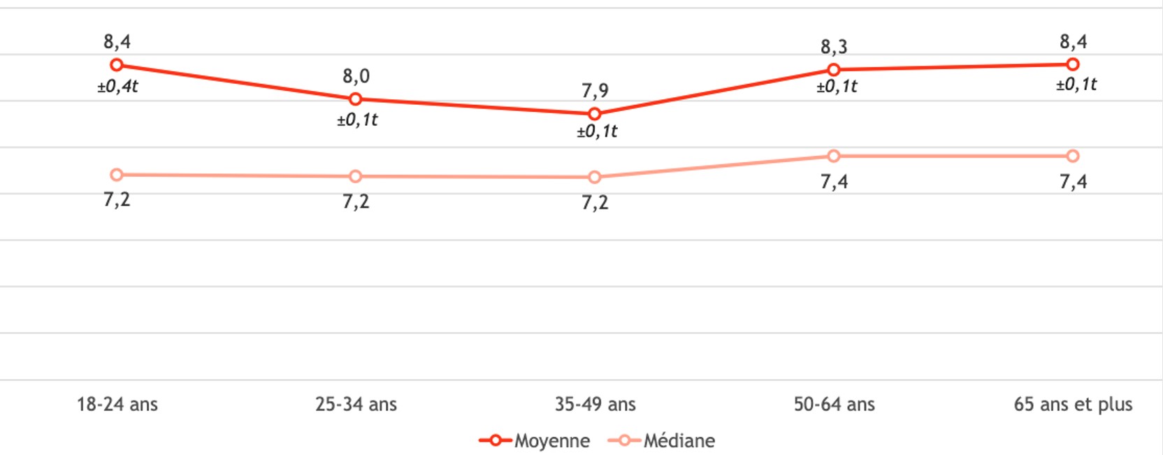 On notera également que c’est au sein de la population des 18-24 ans que les écarts entre individus semblent être les plus marqués — ce qui se traduit notamment par un écart entre moyenne et médiane un peu plus élevé que dans les autres catégories d’âge.
