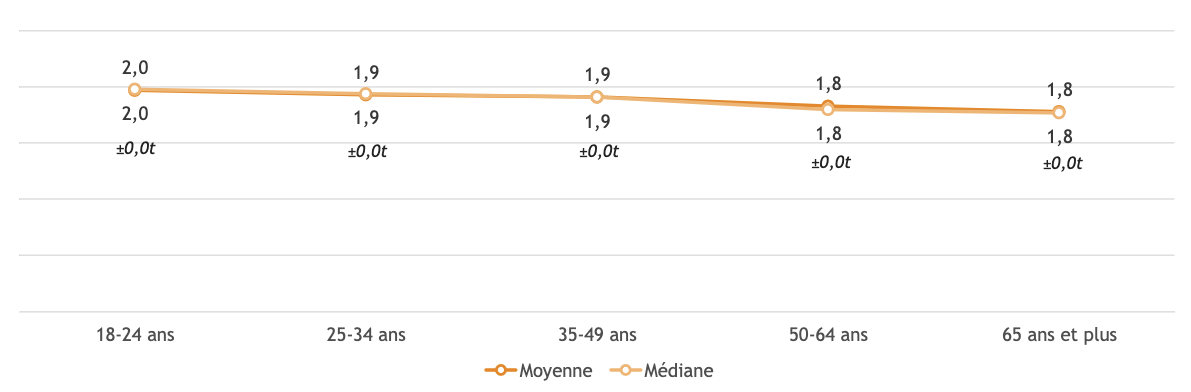 L’âge ne semble pas être un facteur important de différenciation de l’empreinte carbone liée à la consommation des autres biens et services susmentionnés (c’est-à-dire « autres que la mobilité, le logement et l’alimentation »). Comme pour l’alimentation et la viande, il semble que l’impact carbone de ce poste de consommation baisse très légèrement avec l’âge.