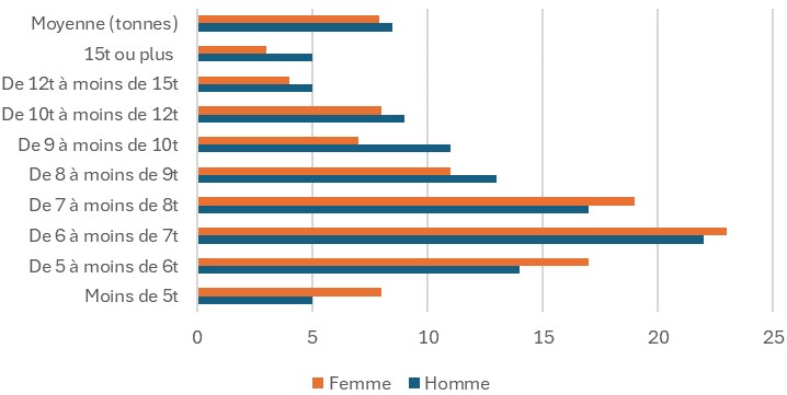Les femmes parcourent également moins de distance que les hommes : 12,5 % des déplacements des femmes font moins de 5 km contre 9,3 % chez les hommes. Les femmes travaillent plus près de leur domicile avec une distance moyenne de 14,8 km (contre 18,5 km pour les hommes). Ainsi, même à catégorie sociale égale, les hommes utilisent moins les transports collectifs que les femmes et effectuent des trajets plus longs (INSEE, 2023).