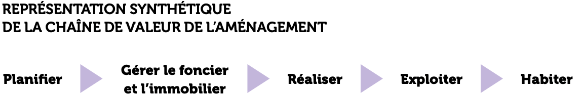 Partant de là, et dans l’optique d’identifier les leviers d’actions mobilisables, la feuille de route choisit de présenter l’aménagement comme une chaîne de valeur, c’est-à-dire un enchaînement d’actions qui part de la planification et va jusqu’à l’acte final d’habiter, en passant par différentes étapes comme la gestion du foncier, la réalisation des aménagements (infrastructures, bâtiments, espaces verts, etc.) et enfin l’exploitation de ces derniers.