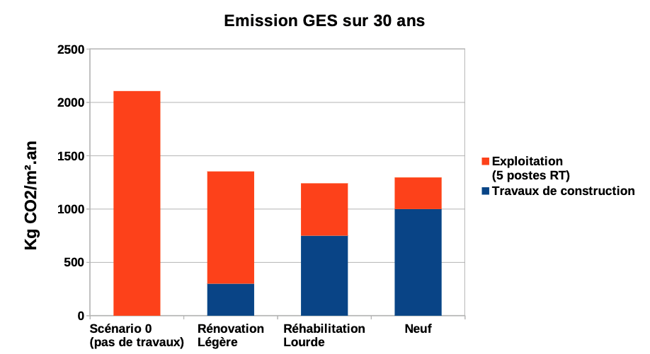 Sur une durée de 30 ans, les bilans carbones d’une construction neuve, d’une rénovation légère et d’une rénovation lourde ont donc tendance à s’équilibrer. Mais au-delà de 40 ou 50 ans, le bilan tourne en faveur de la construction neuve.