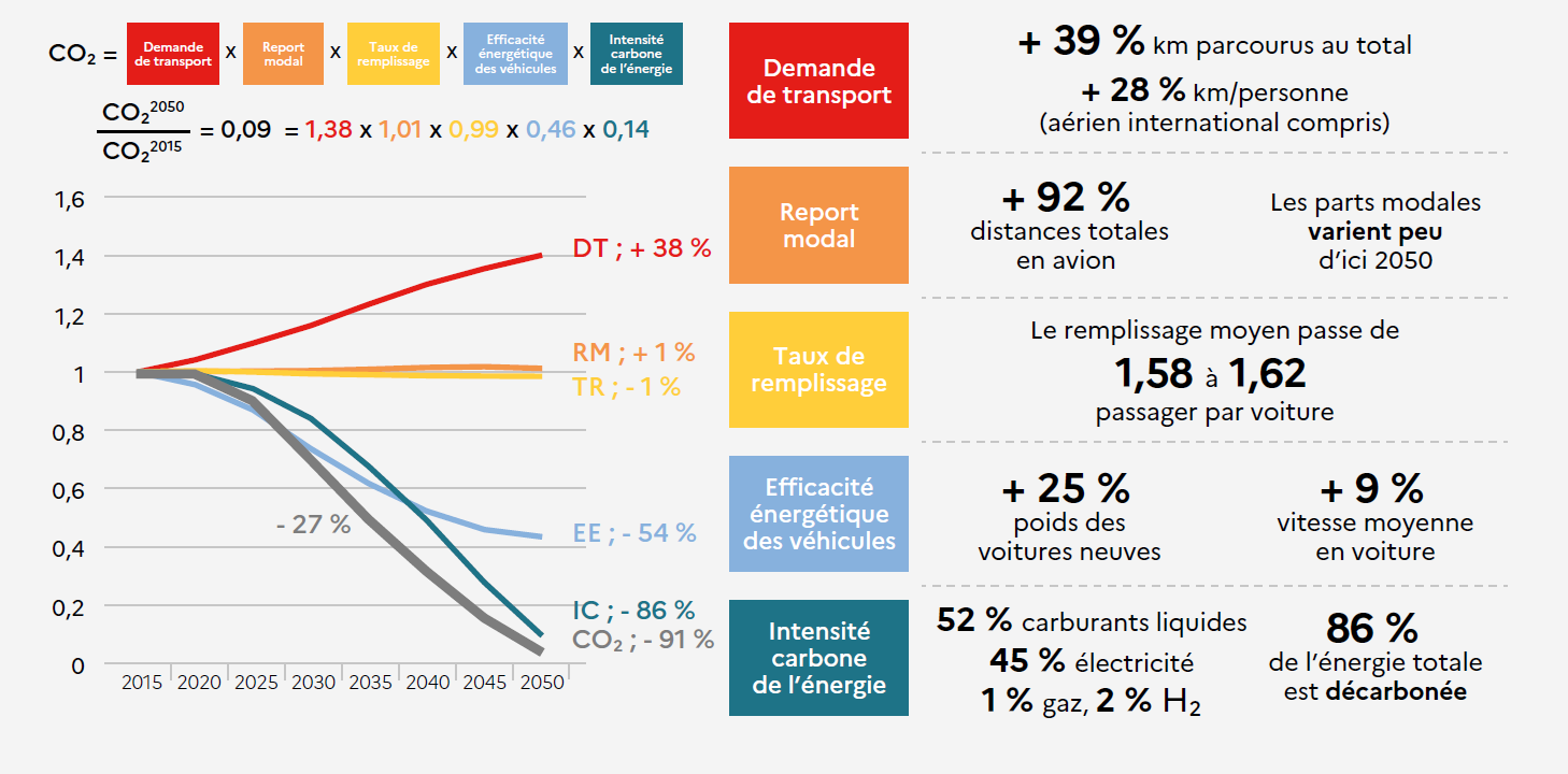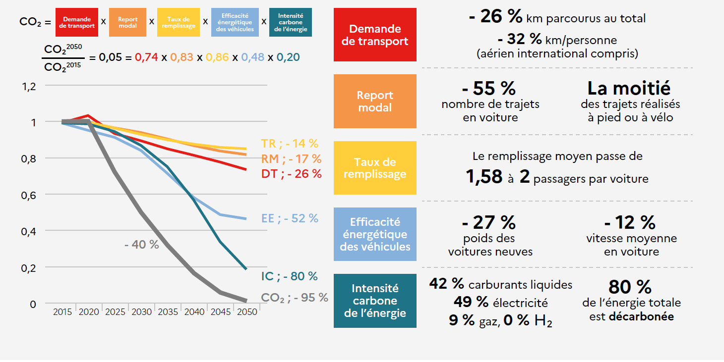 Pour atteindre la neutralité carbone, la Stratégie nationale Bas-Carbone (SNBC) n’envisage pas de changement massif des comportements de mobilité, ni même de baisse du trafic de voyageurs. Au contraire, une progression de 26 % de la mobilité individuelle est projetée d’ici à 2050. Afin de décarboner ce secteur, la SNBC mise donc sur la « transformation complète du parc de véhicules », au profit majoritairement de motorisations électriques.