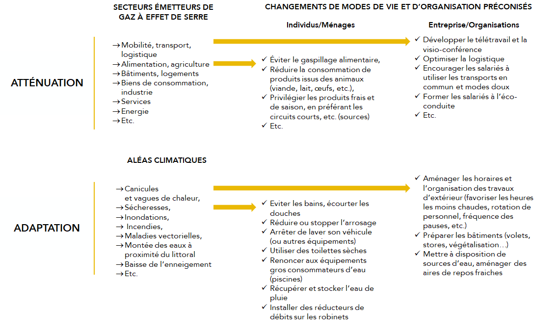 De nombreuses publications produisent des préconisations aux ménages ou aux entreprises afin de réduire leurs émissions de GES ou pour s’adapter au changement climatique. On constate alors que les leviers sont innombrables, au point qu’il est impossible d’en dresser ici un inventaire exhaustif (voir quelques exemples ci-dessous). On retiendra toutefois que :