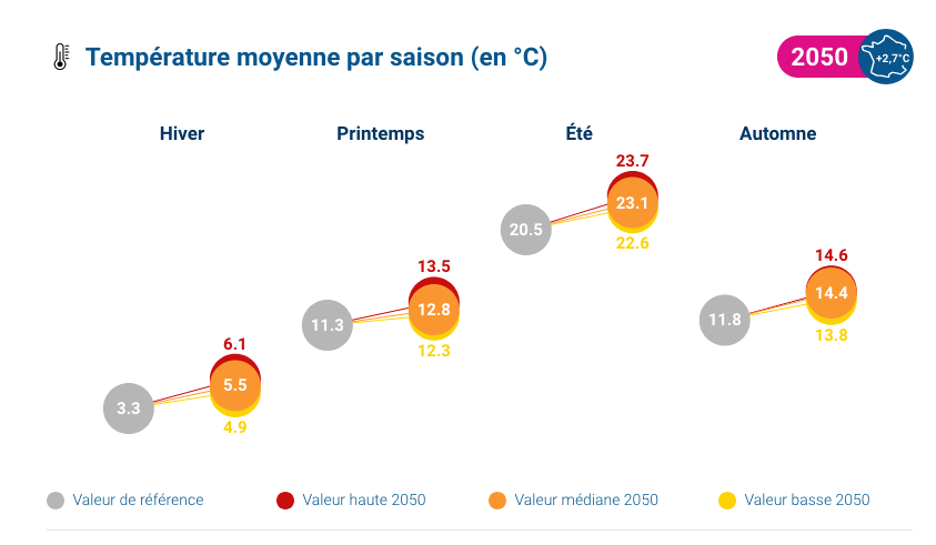 S’il ne correspond pas aux objectifs de l’Accord de Paris, ce scénario de référence est en revanche jugé plus réaliste, car davantage conforme aux engagements actuels des différentes nations. Prenant en compte le fait que la France métropolitaine se réchauffe davantage que la moyenne du globe terrestre, la TRACC retient donc à cette échelle un scénario de réchauffement de +4 °C à l’horizon 2100.