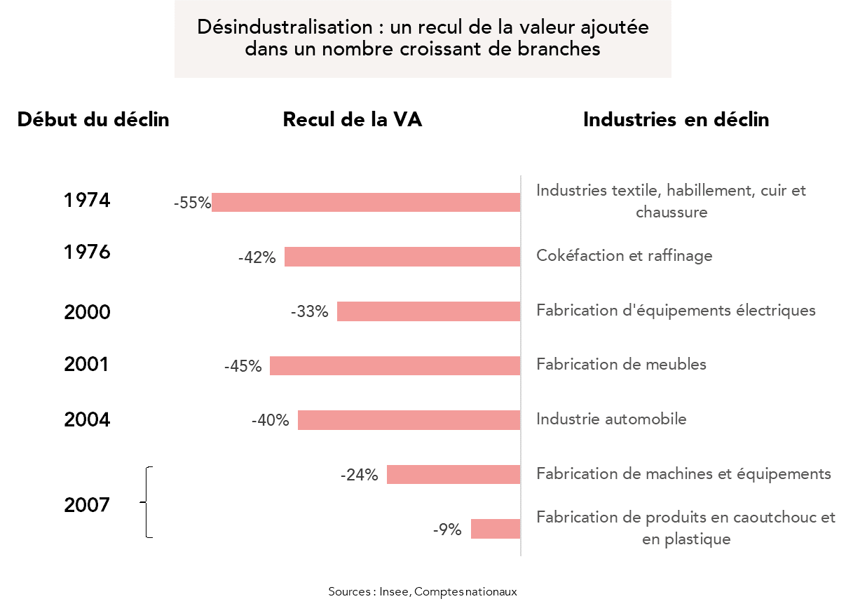 Les conséquences sont douloureuses : recul de la part de l’industrie dans le PIB, nettement plus marqué en France que dans les principales économies occidentales ; effondrement de l’emploi manufacturier (-43 % entre 1974 et 2024, avec un point bas en 2017), dont nombre de territoires ne se sont toujours pas relevés ; et baisse importante de la valeur ajoutée à prix constants, dans un nombre croissant de branches (voir ci-dessous).