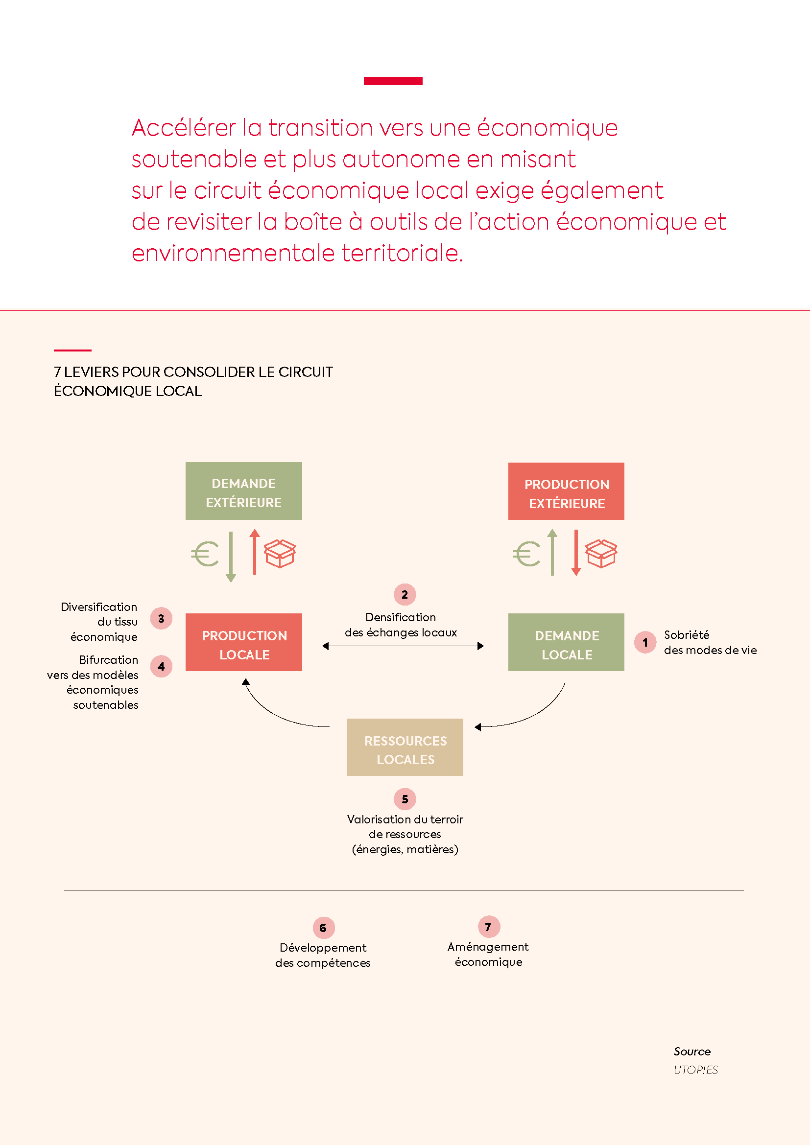 Cette ambition appelle la définition de politiques de transformation économique réorientant les leviers classiques de l’action économique (accompagnement entrepreneurial, animation de filières, soutien à l’innovation, aménagement économique, formation-emploi-insertion, etc.) et décloisonnant les dispositifs des politiques de transition — transition énergétique et climatique, économie circulaire, transition alimentaire, etc. — de manière à dépasser l’effet « patchwork » et à s’appuyer sur une approche réellement systémique du métabolisme territorial.