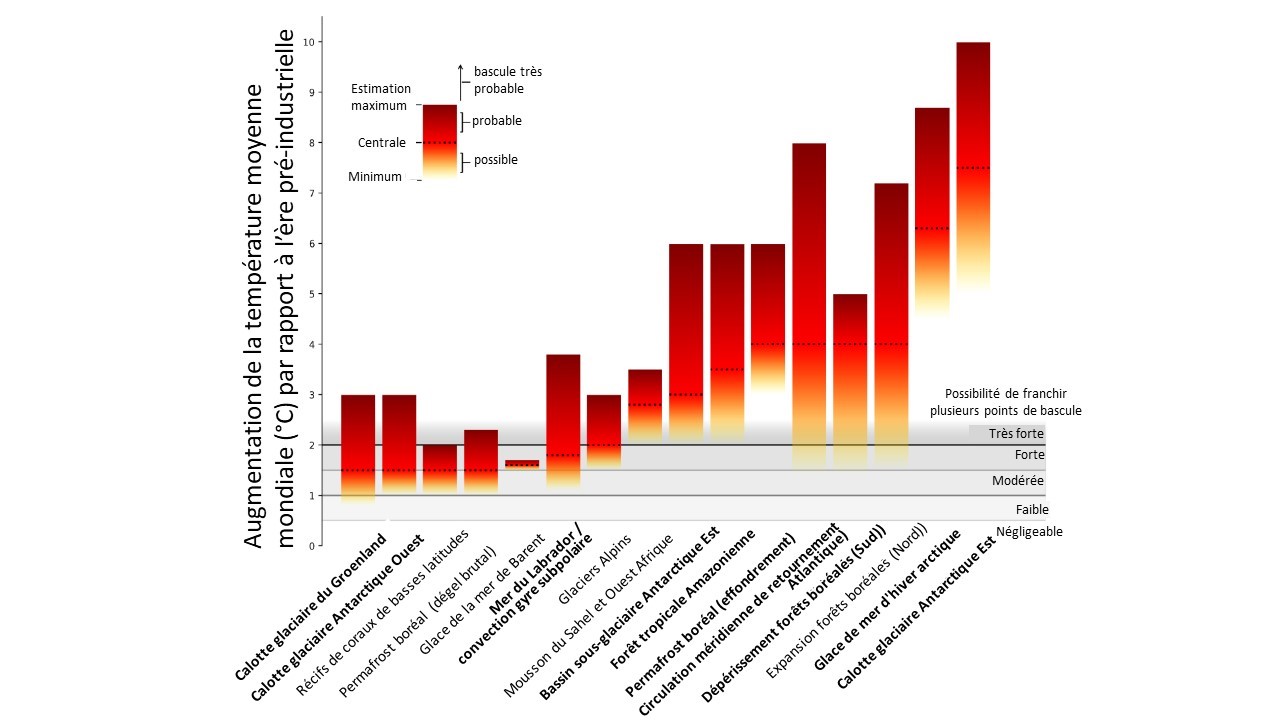 Les scientifiques ont aujourd’hui identifié au moins 16 points de bascule majeurs liés au changement climatique, dont la probabilité d’advenir est représentée dans la figure 1, en fonction du niveau d’augmentation de la température moyenne mondiale.