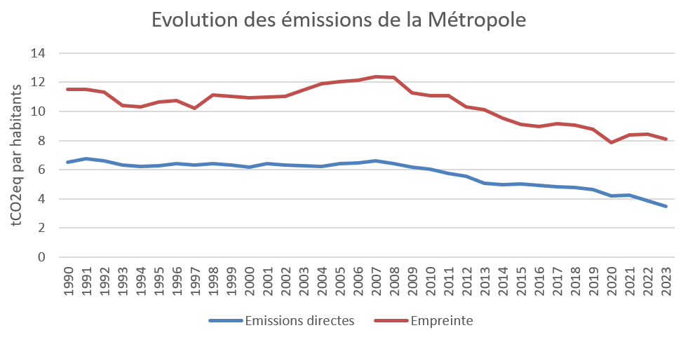 Le respect de ce budget ne pourra donc se faire qu’en passant au plus vite sous cette barre des 1,2 tCO2eq/hab. Cette nécessité de diviser au plus vite par 3 les émissions directes représente un effort considérable, en particulier lorsqu’elle est mise en perspective avec la division par moins de 2 des émissions directes de la métropole obtenue entre 1990 (6,8 tCO2eq/an.hab) et 2023 (3,5 tCO2eq/an.hab).