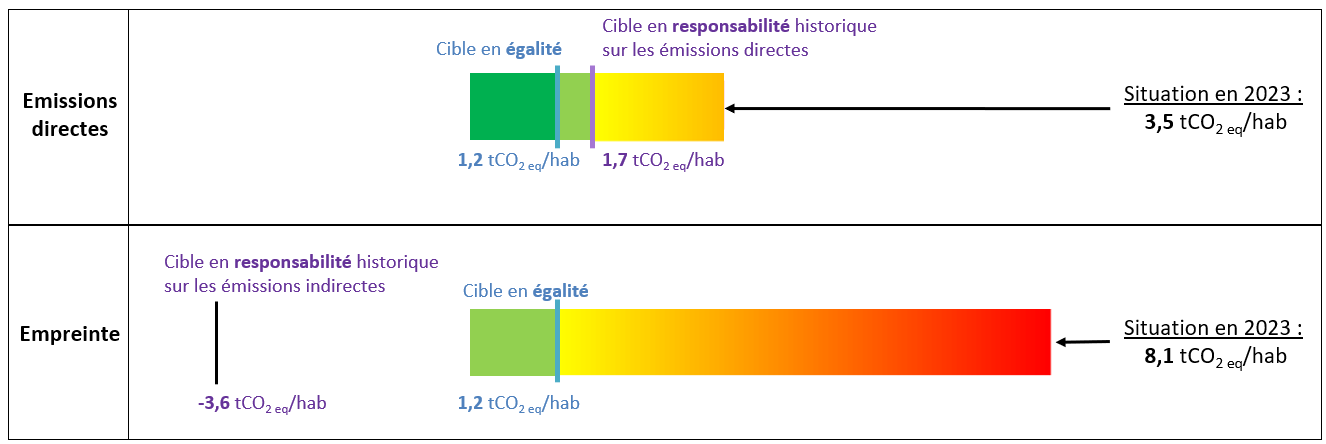 Si l’on considère la responsabilité historique, les émissions directes cumulées des habitants de la métropole de Lyon sont aujourd’hui encore inférieures au budget total d’émissions permettant d’éviter une augmentation de température mondiale de plus de 1,5 °C. Mais si ce budget n’a pas encore été totalement consommé, les émissions actuelles de 3,5 tCO2 eq par an et par personne sont toutefois plus de deux fois supérieures à la cible de 1,7 tCO2 eq par an et par personne.