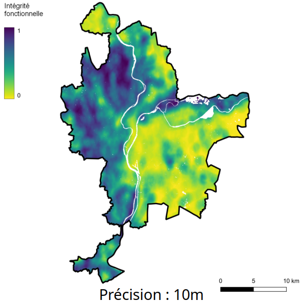 Si les cartes d’intégrité fonctionnelle permettent d’avoir une indication sur les zones en déficit d’habitats semi-naturels (en jaune clair sur la carte, figure 1), elles ne donnent en revanche pas d’information sur le potentiel d’amélioration.
