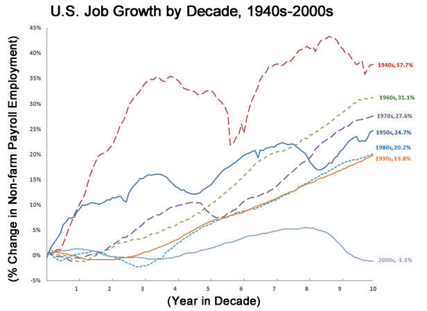 Légende : la croissance de l’emploi aux Etats-Unis par décade, montre que malgré la croissance économique, les Etats-Unis perdent globalement de l’emploi sur la première décade du XXIe siècle.