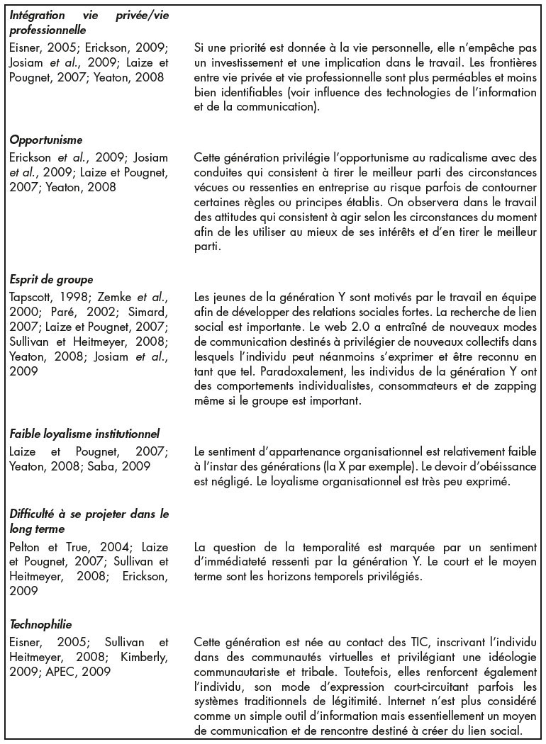 ▪ Après la génération Y, la génération Z : comment les manager ? Publié le 16/04/2015 • Par Sandrine Baglin-Brandel ▪ Génération Y, génération Z, comment intégrer une collectivité locale ? Publié le 22/04/2015 • Par Sandrine Baglin-Brandel ▪ Les valeurs de la génération Y et ses implications pour la gestion : Etude des valeurs individuelles, organisationnelles et de bien être d’une population étudiante en École Supérieure de Commerce, David Moriez, Catherine Voynnet Fourboul ▪ La génération Y ou le paradoxe d’une génération prête à tout sans sacrifice, Alice Le Flanchec, Astrid Mullenbach ▪ Fidéliser des managers de la Génération Y, Aurélie Kleber, Sybille Persson ▪ Une génération comme les autres ou un nouvel élan ? Carine Luangsay-Catelin - Sondage Ipsos pour le monde, 2012 ▪ Réinventer le travail. (Presses Universitaires de France, 2013), Dominique Méda et Patricia Vendramin ▪ L’attraction des salariés de la génération Y : Analyse des attentes selon le genre et le niveau de poste, Anne-Marie Fray, Lucie Morin, Stéphane Renaud ▪ Quelles trajectoires professionnelles pour la génération Y ? Franck Brillet, Patricia Coutelle et Annabelle Hulin ▪ Les Z, ces indomptables du travail, Roxane Baché ▪ Génération Y et Z : Le grand défi inter-générationnel, Daniel Ollivier, Catherine Tanguy