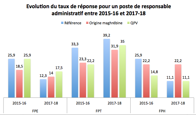 Contrairement au testing de 2016, on ne peut plus établir que la fonction publique pratique globalement des discriminations dans l’accès à un entretien d’embauche. Les preuves statistiques de discrimination sont désormais très localisées : dans le détail, les résultats mettent en évidence l’existence de discriminations liées à l’origine dans la fonction publique territoriale concernant le poste de responsable administratif, ce qu'indique le graphique ci-dessous, puisqu'il y a 7,3 points d'écart dans les taux de réponse entre le candidat au nom "français" et celui au nom maghrébin (39,2 / 31,9). La discrimination à l'origine est aussi constatée dans dans le privé pour le poste d'aide soignante. En revanche une discrimination liée au sexe est constatée en faveur des femmes dans le privé (responsable administratif) et une discrimination liée à la réputation du lieu de résidence en faveur du candidat QPV dans la FPE (responsable administratif), ce qui signifie que dans ces métiers et ces contextes, les tendances se sont inversées.