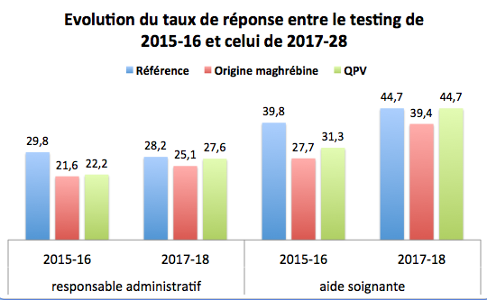 Globalement les discriminations selon l’origine et le lieu de résidence ont diminué entre la campagne de testing de 2015-2016 et celle de 2017-2018. Les chercheurs disent constater « un mouvement de réduction de l’intensité des discriminations dans l’accès à l’emploi depuis 2015 ». Les discriminations en raison de l’origine continuent à exister mais sont moins fortes, et les discriminations selon le lieu de résidence n’apparaissent plus (il faut regarder les écarts de taux de réponse relativement au candidat de référence, qui sont plus ou moins significatifs en fonction de la taille de l'échantillon).