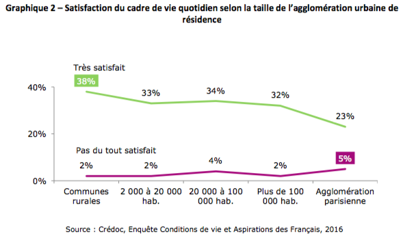 32% des Français se déclarent très satisfaits de leur cadre de vie quotidien, mais ce chiffre varie de 38% pour les résidents des communes rurales à 23% pour les habitants de l’agglomération parisienne. À l’autre opposé du spectre, les personnes se déclarant « pas du tout satisfaites » de leur cadre de vie ne sont que 2% dans les communes rurales et 5% en agglomération parisienne. (CREDOC, 2017)