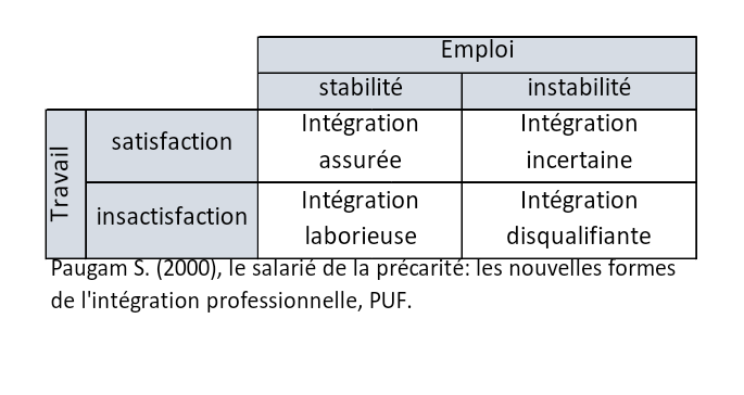 Paugam montre que la qualité de l’intégration sociale que permet le travail fait en priorité intervenir deux facteurs : la stabilité de l’emploi et la qualité du travail. L’intégration est « assurée » lorsque les deux critères sont réunis. Elle est « disqualifiante » lorsque l’individu ne peut se prévaloir ni d’un emploi stable ni d’un travail satisfaisant. Entre ces configurations extrêmes figurent des intermédiaires (intégration « laborieuse » et « incertaine »).