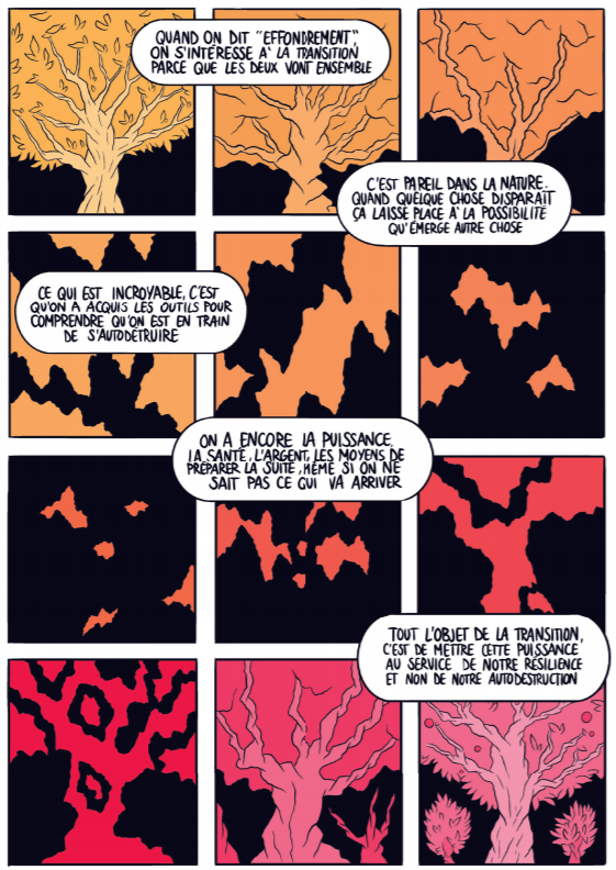 On retrouve plus ou moins ce profil tout au long des reportages dessinés, ces personnes regrettant une militance trop limitée en ville, et exprimant la volonté de se libérer d’un système trop verrouillé pour mieux se préparer aux bouleversements à venir. Pour la plupart, cela passe par le renoncement à leur vie antérieure : urbaine et confortable, mais caractérisée par la dépendance aux systèmes énergétique, alimentaire et politique.
