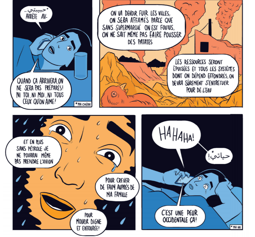 Ce livre retrace également l’apprivoisement mutuel des deux auteurs, d’origines et de générations différentes, qui réagissent de manière distincte aux discours sur un effondrement prochain. Pour Raphaëlle Macaron, qui découvre tout juste la collapsologie, la retenue laisse place à « l’éco-anxiété », cette angoisse contemporaine aux frontières du désespoir. Mais petit à petit, sa vision se nuance sous l’influence de ses parents, Libanais ayant connu la guerre, et de Noël, pour qui il ne s’agit pas de la fin du monde, mais seulement d’un monde, un changement nécessaire qu’il nous faudra accompagner.