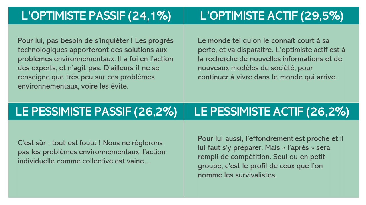 Les profils actifs ont en commun la mise en action, et ils semblent souvent réduits à des figures caricaturales : communautés autogérées adeptes de la permaculture d’un côté, survivalistes collectionneurs de boîtes de conserve, d’armes et de stages de survie de l’autre. L’optimiste actif apparaît souvent dans notre imaginaire comme ce jeune citadin diplômé, bénéficiant de ressources socio-culturelles et économiques importantes, et qui fait le choix de migrer à la campagne pour mener une vie plus proche de ses idéaux.
