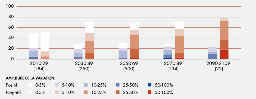 La production agricole est quant à elle obligée de s’adapter. Les vendanges sont par exemple réalisées en moyenne 2 semaines plus tôt qu’il y a 40 ans, et les stades de floraison des fruitiers apparaissent de plus en plus précocement, ce qui augmente le risque d’exposition au gel. Dans un premier temps, le rendement agricole devrait baisser dans le Sud et dans les régions tropicales, et augmenter au nord et en milieu tempéré (FAO, 2016). Mais après 2030, les pertes de rendement agricole liées au changement climatique devraient dépasser les gains, et les rendements agricoles mondiaux pourraient alors baisser. Face aux pénuries d’eau, de nombreuses cultures vont donc devoir s’adapter (choix des variétés, adaptation des techniques agricoles) ou carrément changer d’organisation (abandon de certaines cultures, nouveaux systèmes de production comme l’agroforesterie, etc.).