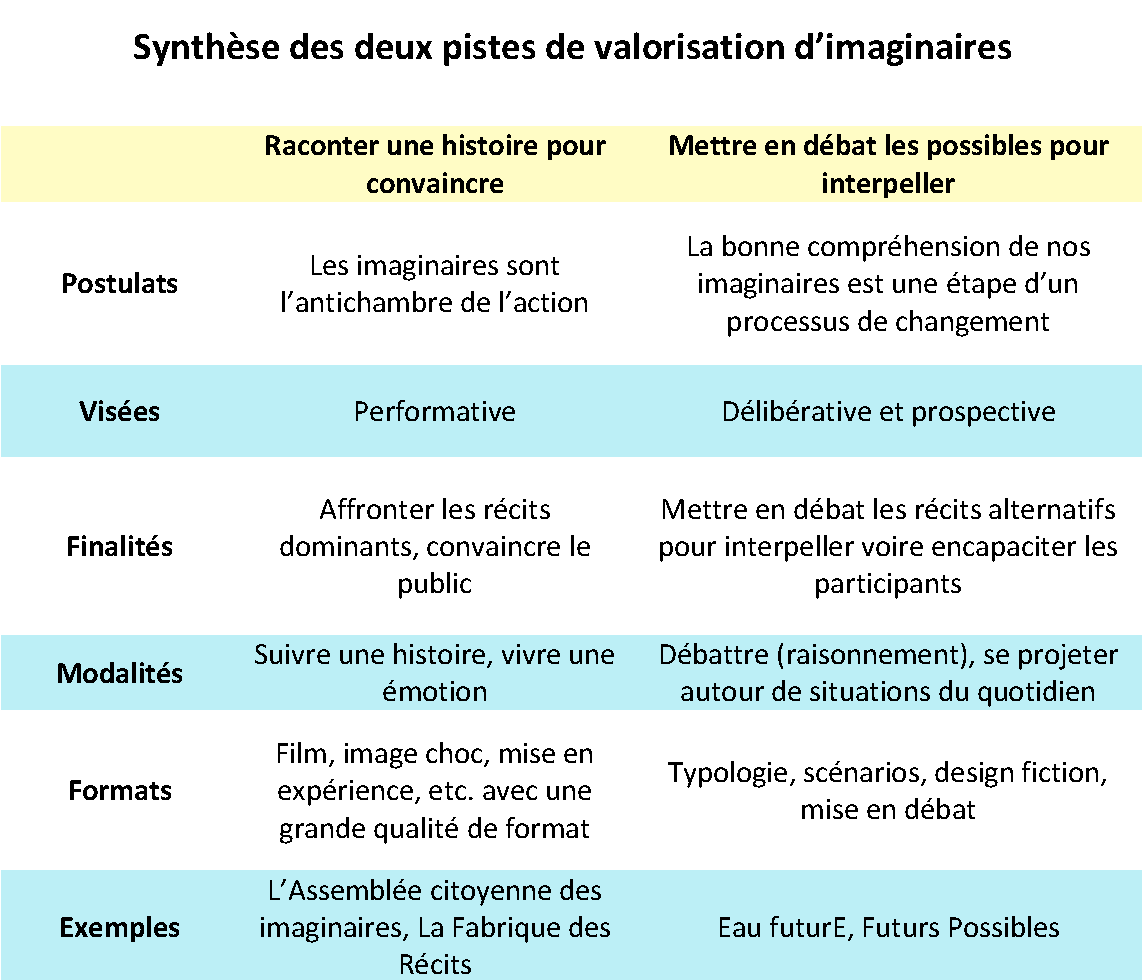 On le voit, ce que l’on peut attendre des imaginaires et la façon dont on peut les utiliser et valoriser peut différer d’un projet à l’autre (voir tableau ci-dessous). Pour schématiser, dans le voyage vers le futur qu’est le récit désirable, l’imaginaire joue, dans la première voie, le rôle d’un prospectus : une représentation enviable de ce que l’on pourrait vivre, qui active le désir, même si la réalité vécue sera vraisemblablement différente. Dans la seconde, l’imaginaire joue plutôt le rôle d’une boussole : plusieurs représentations inspirées des aspirations du présent dessinent autant de points cardinaux, par définition inatteignables, vers lesquels on pourrait se diriger. Charge au participant de composer son avenir désirable.