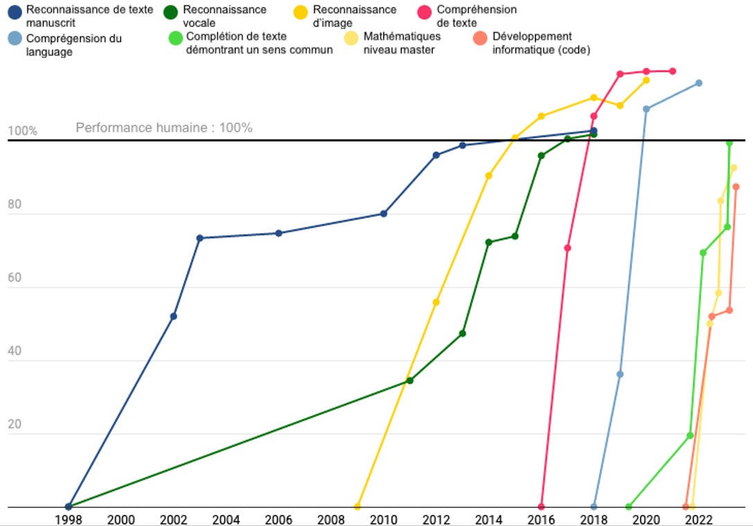 Évolution de la performance des meilleurs systèmes d’IA dans différents types de tâches au cours des années. Pour chaque type de tâche, le système d’IA le plus à la pointe de la discipline est évalué selon un test normé, et ses performances sont comparées à celle d’un humain, dont la note est arbitrairement fixée à 100 %. Au cours du temps, l’IA dépasse les humains dans un nombre croissant de tâches, et le rythme de progrès s’accélère pour chaque nouvelle discipline. Source : Kiela D., Trush, T., Ethatyarjh, K., 2023, Plotting progress in AI