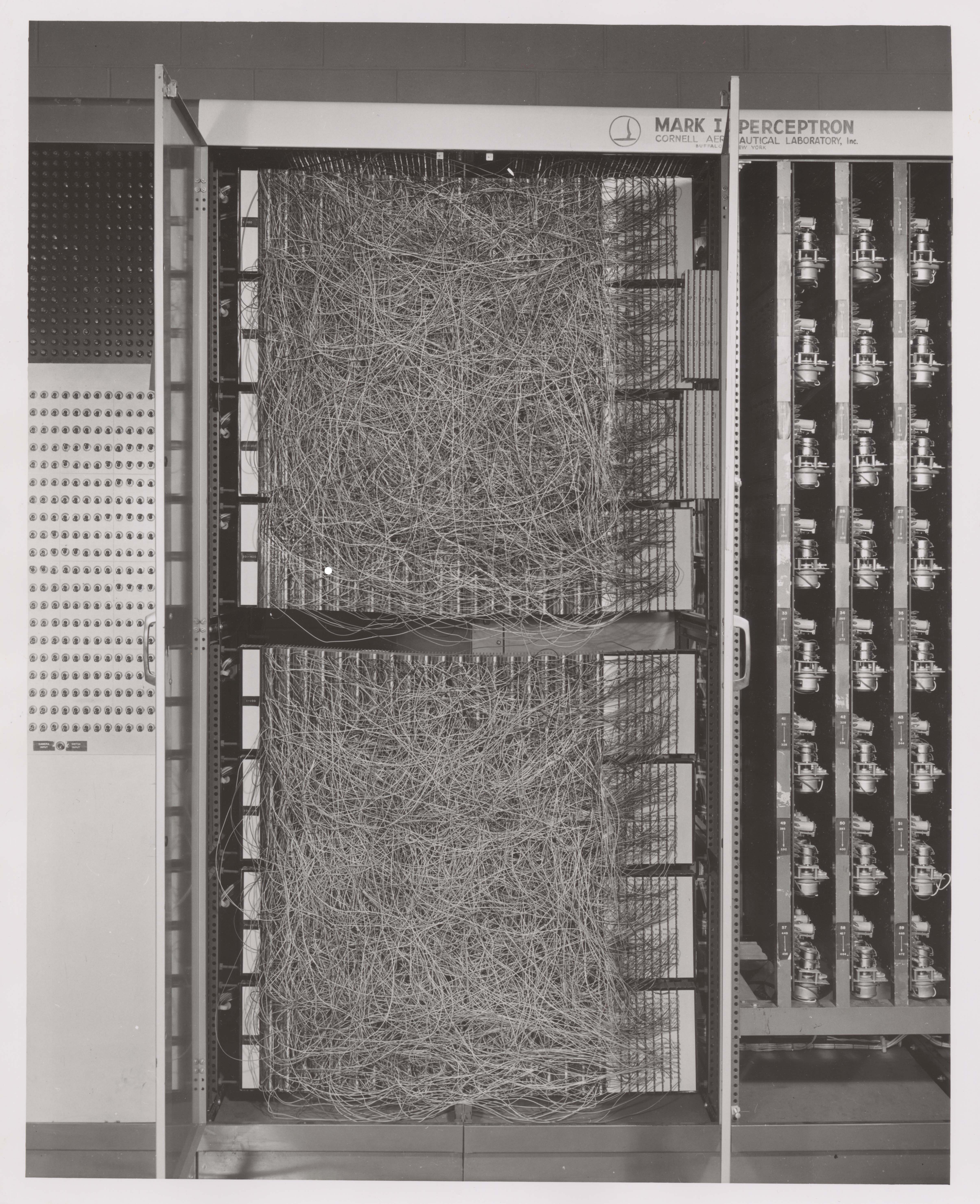 En, 1958, le premier réseau de neurones artificiels voit le jour. Composé d’une couche de cellules photoréceptrices connectée à une unique couche de neurones formels, ce système était conçu pour la reconnaissance d’images. D’abord installé sur un ordinateur de cinq tonnes, puis conçu comme une machine dédiée, le Perceptron Mark I est, selon son créateur Frank Rosenblatt, « la première machine capable de formuler une idée ». Après entraînement supervisé sur une cinquantaine de cartes perforées, le système se montrait capable de distinguer celles marquées du côté gauche de celles marquées du côté droit.