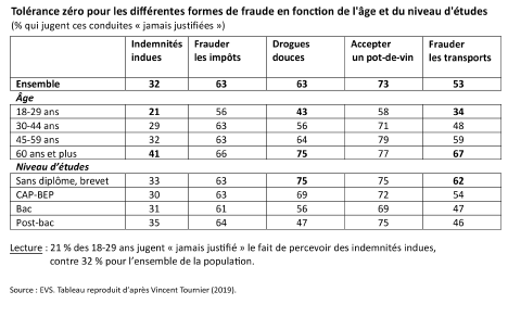 On retrouve cet effet de génération dans le rejet croissant de la fraude comme le montre Vincent Tournier (2019). Les jeunes sont toujours moins intransigeants envers la fraude et les actes illégaux que les groupes plus âgés (EVS 2018, résultats pour la France).