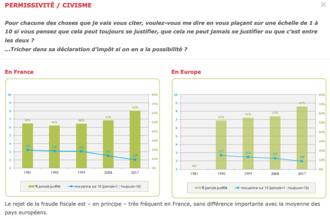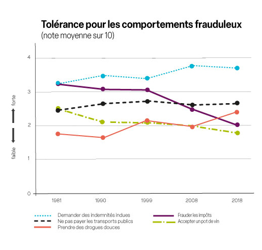 La désapprobation a nettement augmenté en matière de fraude fiscale (la tolérance est passée de 3,2 à 2 sur 10). Elle a augmenté aussi quant à l’acceptation des pots-de-vin (la tolérance est passée de 2,5 à 1,8 entre 1981 et 2017). À l’inverse, on observe une tolérance légèrement croissante à la demande d’indemnités indues (de 3,3 à 3,7), sans doute parce que la dimension délictuelle de l’acte apparaît moins évidente : selon Vincent Tournier, « percevoir des indemnités au-delà de ce à quoi on a droit » sous-entend qu’il s’agit d’une exagération, et non pas de percevoir des indemnités auxquelles on n’a pas droit. Pour la fraude aux transports, la tolérance croit de façon modérée (de 2,5 à 2,7).