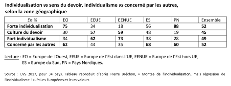 Le tableau met en évidence que cette évolution européenne moyenne cache des différences géographiques importantes. Les pays nordiques et d’Europe de l’Ouest sont peu individualistes et très individualisés, l’Europe du Sud est en position intermédiaire, alors que les pays de l’est de l’Europe sont très individualistes et peu individualisés. La culture de l’individualisation s’est surtout développée dans les groupes favorisés et les pays riches et là où la religiosité est faible. L’individualisme est nettement plus développé dans les catégories populaires et dans les pays pauvres, chez des personnes religieuses et conservatrices sur le plan des valeurs.