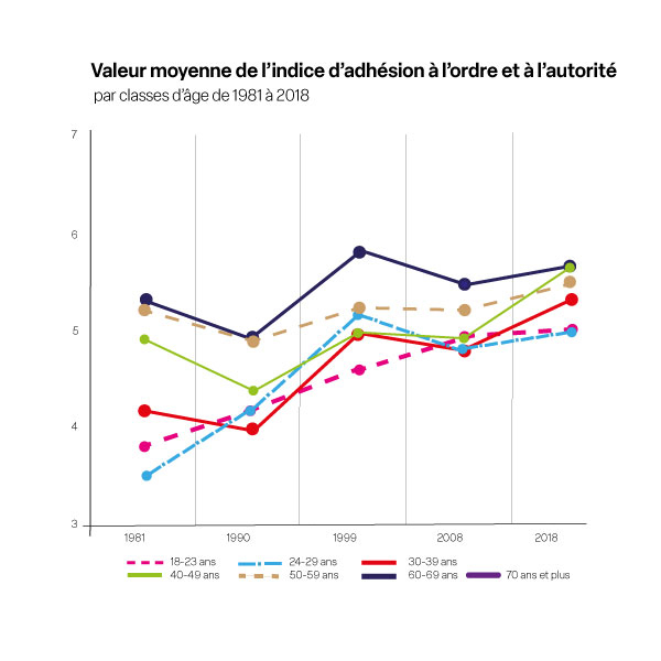 Un effet de génération se mesure dans l’adhésion à l’autorité. L’adhésion croissante des Français à l’autorité « s’est accomplie à la suite d’un très net rapprochement des opinions sur le sujet des différentes classes d’âge », note Olivier Galland, ce que montre le graphique « Valeur moyenne de l’indice d’adhésion à l’ordre et l’autorité par classes d’âge de 1 981 à 2 018 » situé plus haut dans le document.