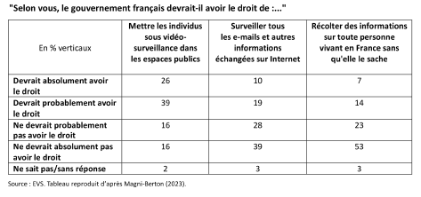 Les Français adhèrent à la surveillance de l’espace public par les autorités, et plus précisément à la présence de la vidéosurveillance. En raison de l’absence de la question de son acceptation avant la vague d’enquête EVS de 2016-2018, les données ne permettent pas de mesurer des évolutions. 65 % des Français estiment que « le gouvernement français devrait avoir le droit de mettre les individus sous vidéosurveillance dans les espaces publics » (26 % absolument, 39 % probablement). Pour la suite on se réfère à Raul Magni-Berton, « Contrôle étatique et libertés publiques », in Les Européens et leurs valeurs (2023).